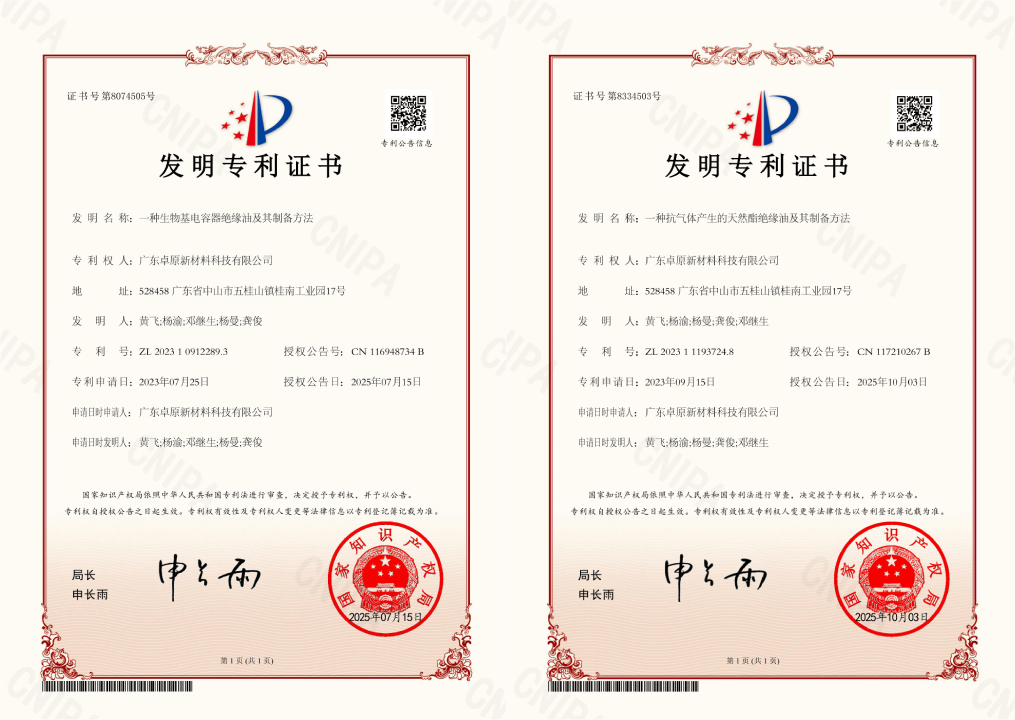 2016年,卓原新材建成日产25吨的天然酯绝缘油生产线,产品质量和生产规模国内领先。公司具备电气试验室及化学试验室,拥有完备的电气、化工试验设备。