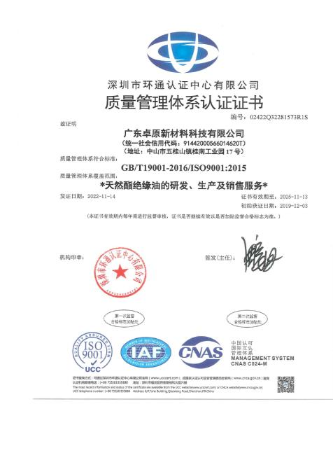 广东卓原新材料科技有限公司(西安卓源电力科技有限公司已于2015年7月1日正式更名为广东卓原新材料科技有限公司)是按照现代企业制度组建的有限责任公司,为国家高新技术企业,下设研究院———中山市新型研发机构,公司长期致力于环保、可再生、高性能新型天然酯绝缘油的研发、生产与销售。