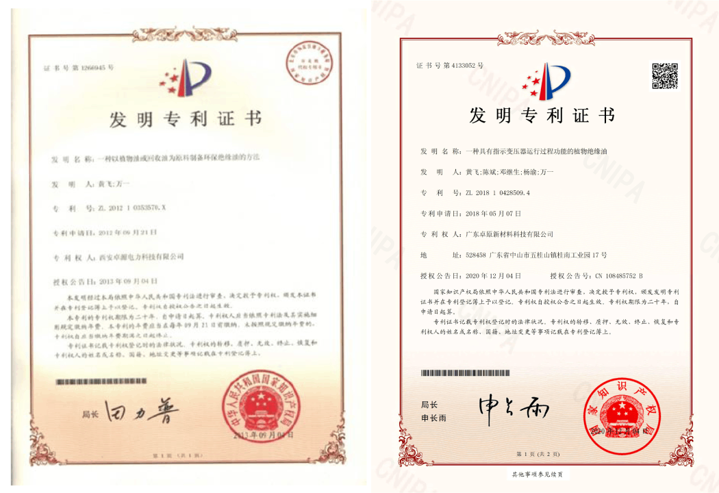 作为公司的主导产品,RAPO®天然酯绝缘油目前已获得国家发明专利 “一种以植物油或回收油为原料制备环保绝缘油技术”的发明专利证书(专利号:ZL201210353570.X),通过国家级权威检测机构———西安热工研究院的产品检测,产品性能达到国际先进水平;公司项目于2014年经陕西省科技厅推荐、国家科技部审查,被纳入国家863计划入库项目;2017年初,公司天然酯绝缘油生产技术被国家发改委选入《国家重点节能低碳技术推广目录(2016年本中低碳部分)》;同年2月,天然酯绝缘油变压器作为节能环保产品正式列入我国《战略性新兴产业重点产品和服务指导目录》。